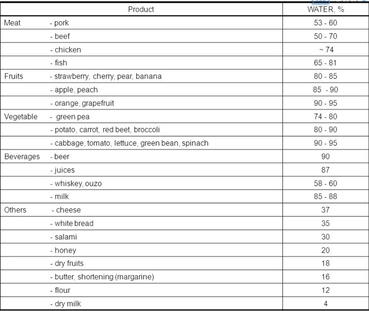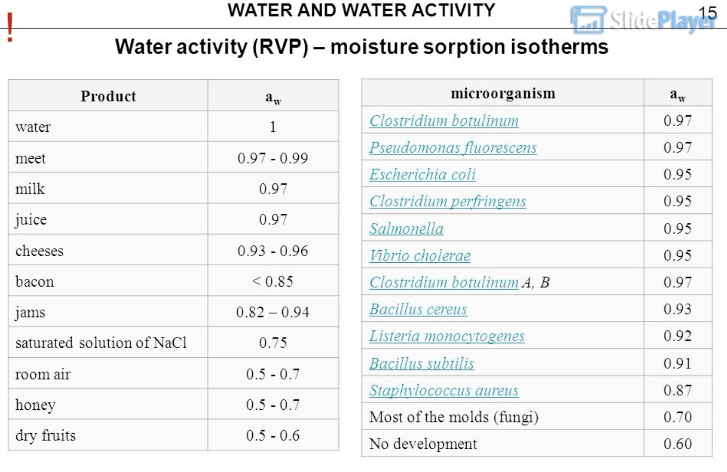 The table below shows the water activity values of some foods as well as the required water activities levels for the development of certain microorganisms.