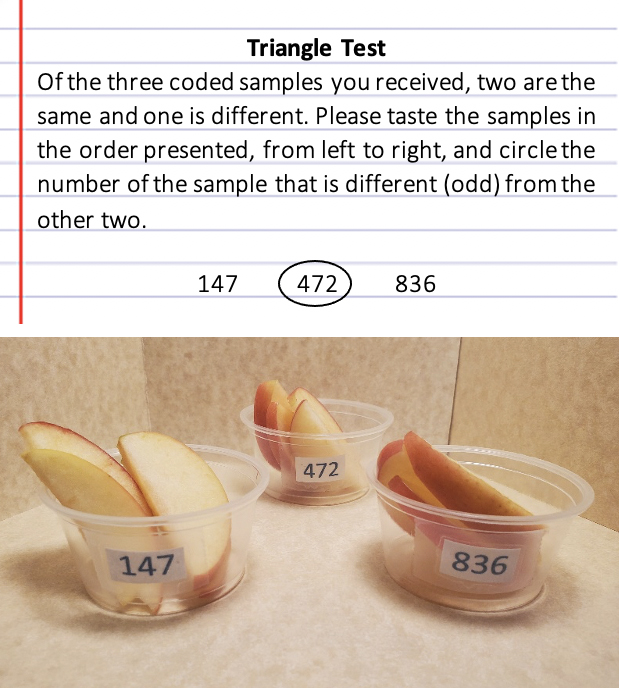 The examiner is given written instructions and is requested to find the deviating sample. The examiner is also instructed to make a guess in case no difference can be definitely determined. In that case the examiner has to leave a remark that the decision was the result of a guess.