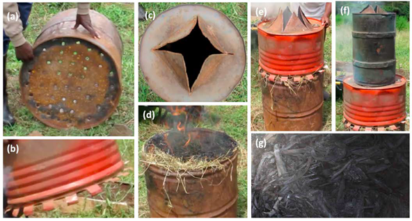 Operating the kiln: Make sure that the ground is even, then elevate the kiln on three rocks about 5 cm above the ground. Load the biomass in alternating easy-to-light and difficult-to-light layers. Make sure that both the bottommost and the topmost layers are easy to light on fire. Once the kiln is filled, evenly light the top of the kiln on fire. Once the fire has spread throughout the kiln, as seen in (d), cover the main kiln with the adapter, followed by the chimney, as shown in (e) and (f). After about 15-20 minutes, the combusting layer (where the heat is located) should migrate from the topmost layer of biomass to the bottommost layer, at which point it is necessary to cover the kiln completely by applying the lid at the top, removing the stones at the bottom, and sealing all possible cracks with sand, as seen in (g). The kiln is then left to cool for 1-2 hours until it is safe to touch the exterior, or if in a hurry, the kiln can be cooled by applying water to it. After the kiln has cooled, the charred biomass can be harvested, ground to fine powder, and briquetted using a press and/or a binding agent.