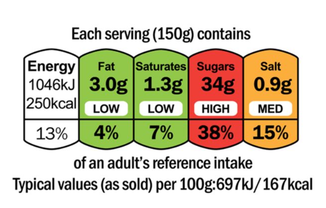 Color-coded nutritional information tells consumers if the food is high, medium or low in fat, saturated fats, sugars and salt (red = high, yellow = medium, green = low). If your product is low in all of these, you may use this kind of display on your label to attract health-conscious customers).