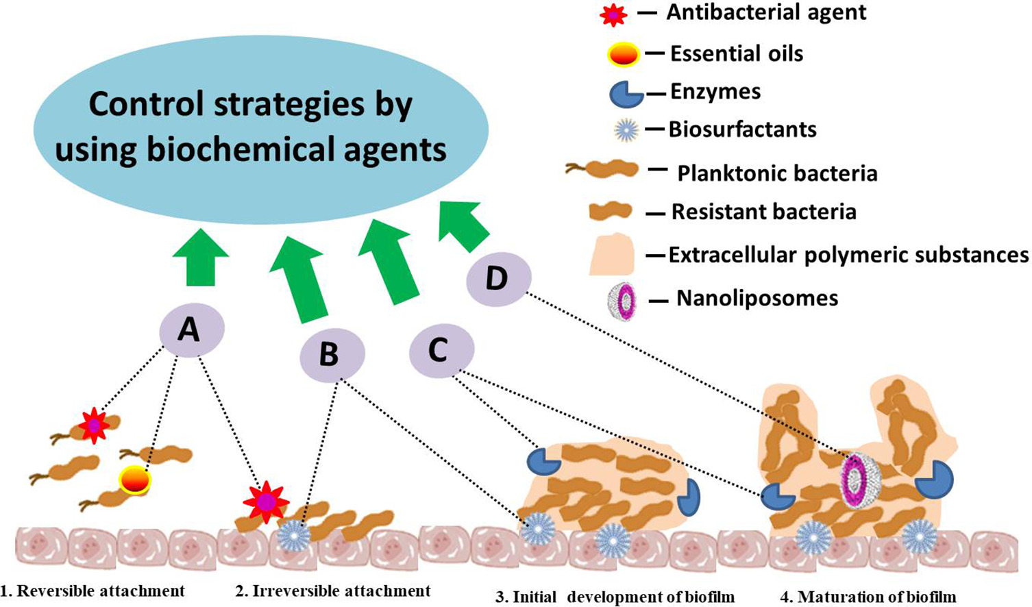 Various other methods have been developed from different aspects, such as inhibition of bacterial adhesion and bacterial detection in the early stage, as well as dissolving the biofilm. New strategies involve biochemical agents including clove and thyme essential oils, enzymes, biosurfactants, and others for “green” approaches to control pathogen biofilms formation.