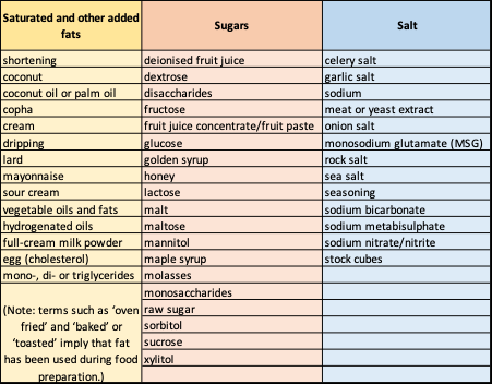 Many customers nowadays want to lower their intake of saturated fats, salt, and sugar. To "hide" these, manufacturers can list the different ingredients used in the product, instead of labeling these as fats, sugars and salt: