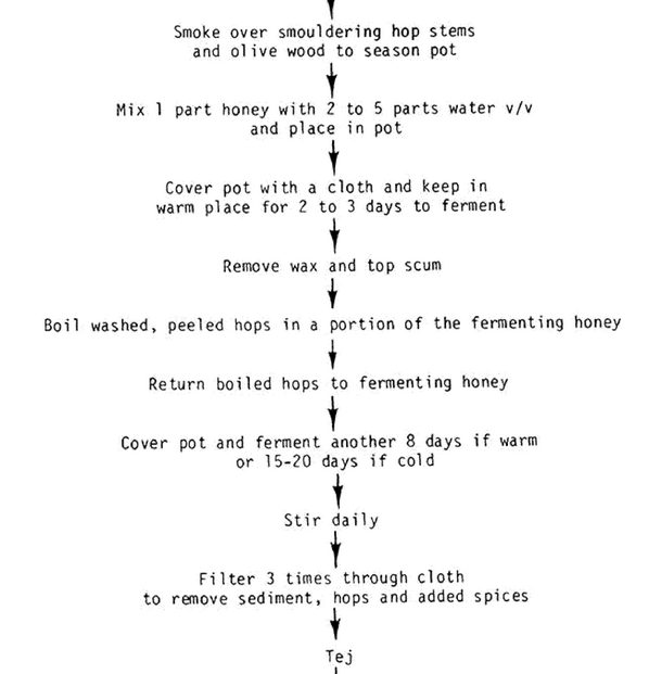 TejTej is a home-made honey wine from Ethiopia, used only at special occasions. It is yellow, sweet and has different tastes depending on the region and honey of origin. The fermentation vessel is smoked to give the honey wine a smoky flavour. Also hopes and ginger may be added for flavouring. Honey (and for cheaper versions a mixture of honey and sugar) are diluted with water (1:2 to 1:5) and left to ferment for 2 - 3 weeks, until it reaches an alcohol content of 7-14% Vol. The dominant yeasts are Saccharomyces sp., which are introduced with the pollen content of the honey. | ||