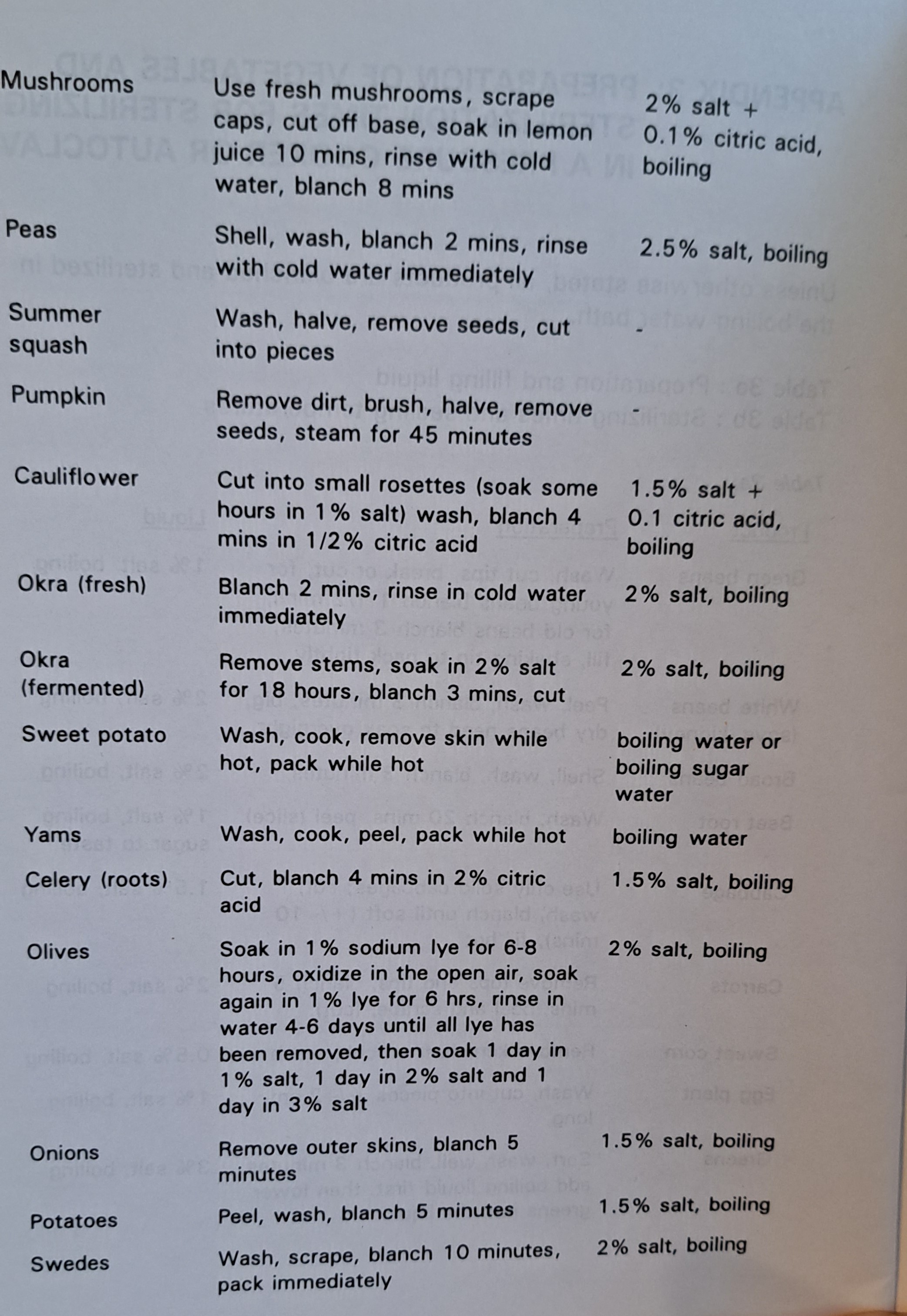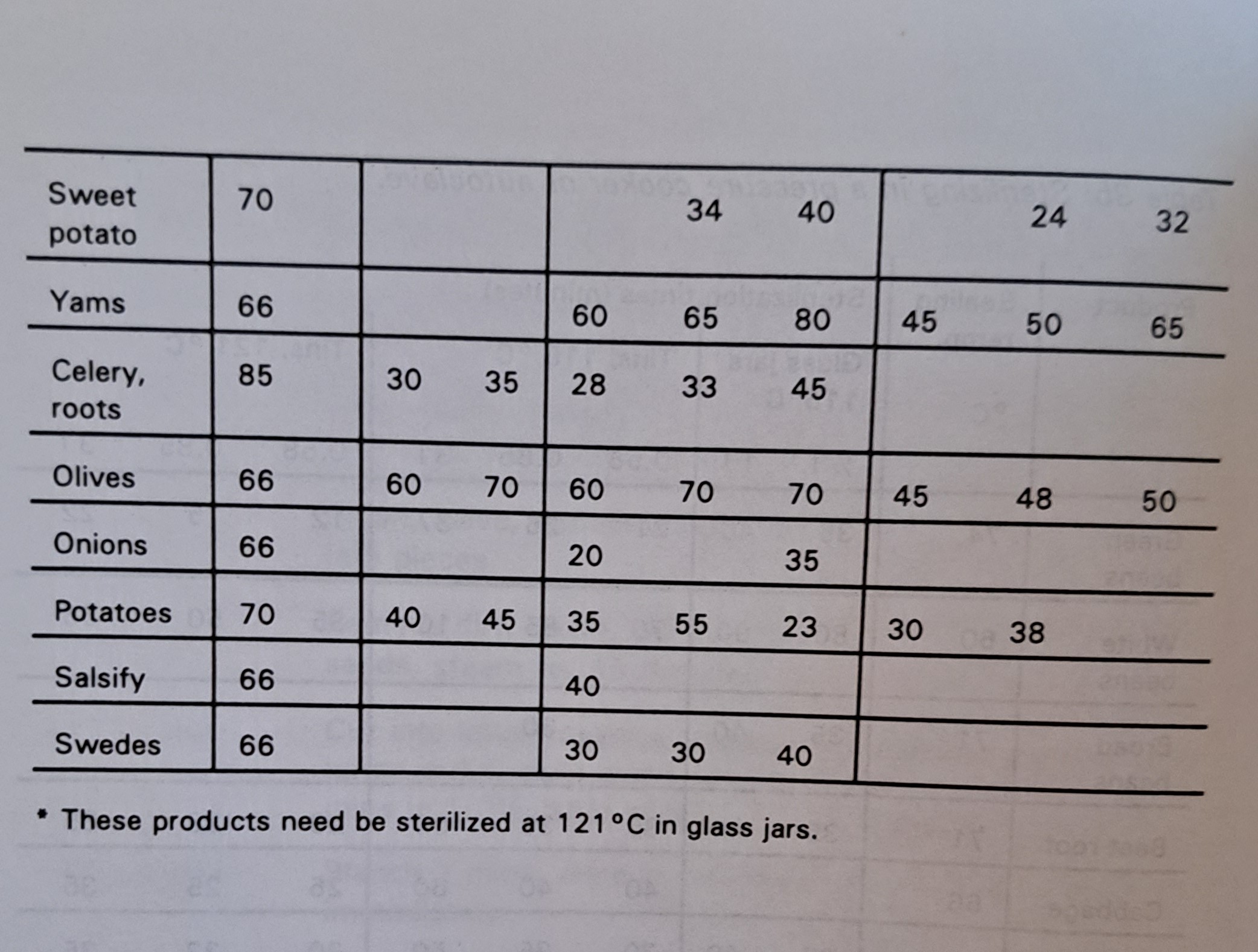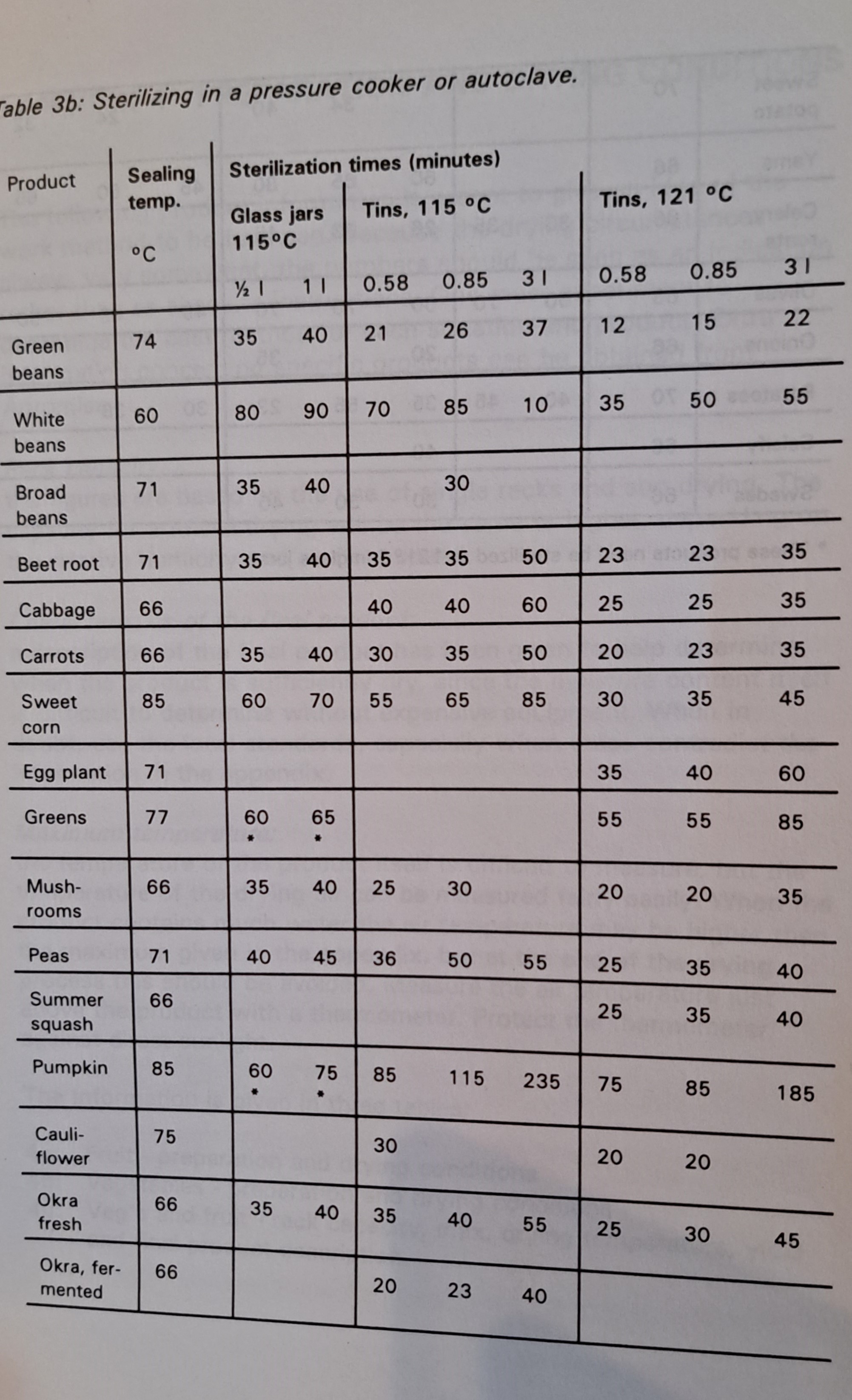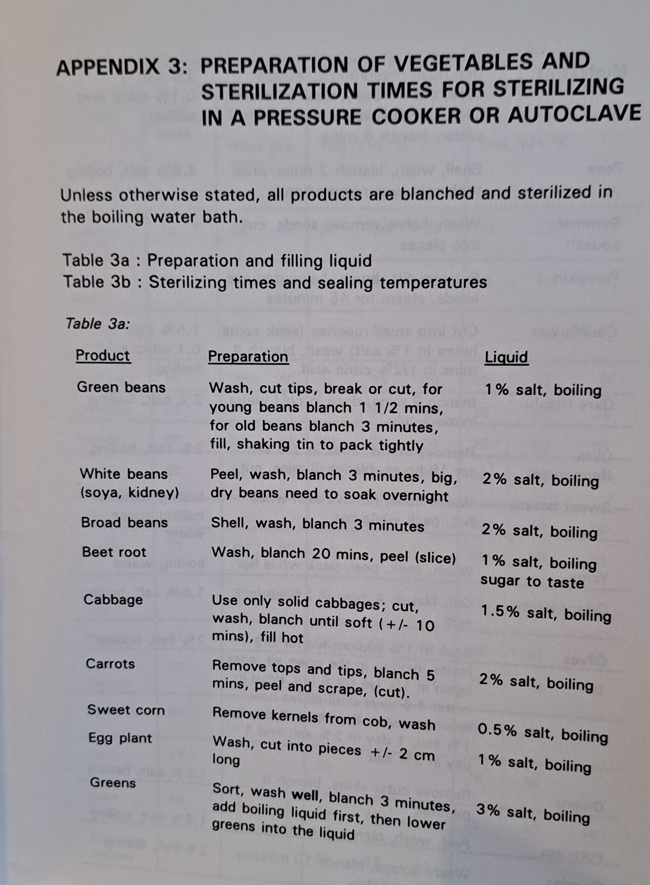 Preparation of vegetables and sterilization times for sterilizing in a pressure cooker or autoclave